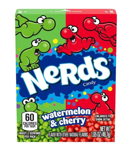 Nerds bring a distinctive appeal to Christmas sweet selections through their unusual format and intense flavours. Introduced by the Willy Wonka Candy Factory in 1983 and now produced by Nestlé, these tiny, irregularly shaped candies typically come in dual-flavoured boxes with separate compartments.